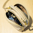 Inside, the multi-compartment design keeps your items neatly organized, with enough space to hold an iPad mini, wallet, makeup, and daily essentials.
